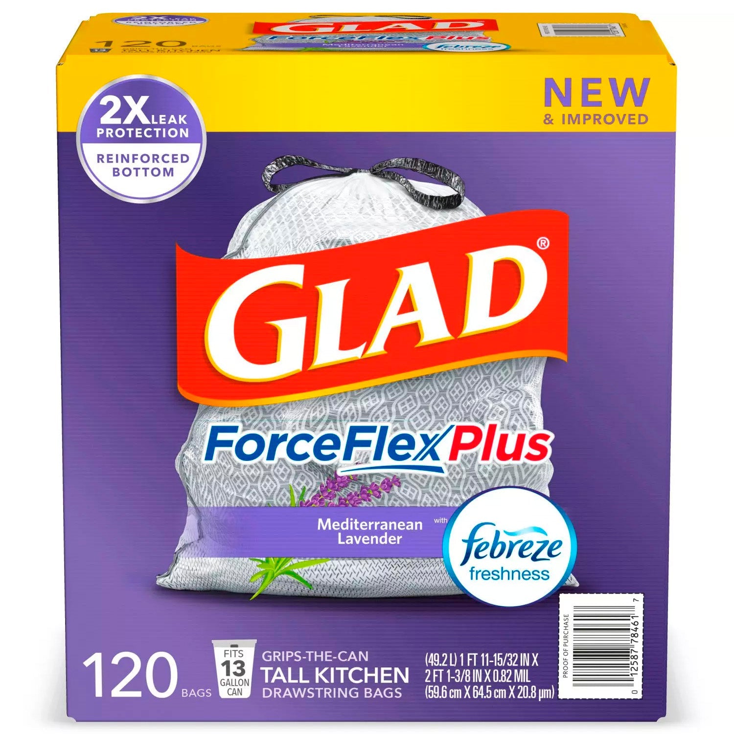 Product Description Glad® ForceFlexPlus™ Trash Bags in Mediterranean Lavender™ Scent provide strength plus odor control, to keep your home smelling fresh and clean. These kitchen garbage bags are made with 3 in 1 OdorShield® technology and Febreze freshness for guaranteed 5 day odor control, based on lab test compared to unscented bags. These trash can liners are double layered to trap, lock and neutralize odors. The unique diamond pattern of the garbage bag is equipped with LeakGuard™ for added leak protection, while the RipGuard™technology stretches and provides reinforced strength to prevent rips and tears. With the 3 ply drawstring, which grips the can, the bag stays in place until you are ready to take it out. The drawstring bag makes closing and carrying easy. These 13 gallon size, odor neutralizing, trash bags, fit tall kitchentrash cans, and are perfect for use in kitchens or seasonal cleaning like Spring Cleaning and Back to School. Features 13 GALLON WHITE PLASTIC TRASH BAGS: Handle daily kitchen and household demands with Glad's 13 gallon tall kitchen garbage bags in a Febreze Mediterranean Lavender scent FORCEFLEX STRENGTH: Glad ForceFlexPlus provides superior strength with two-layer protection – LeakGuard plus RipGuard provide protection against leaks, rips and tears 7 DAY ODOR CONTROL: 3-in-1 OdorShield works to trap, lock and neutralize tough odors– eliminate smells in the kitchen and around the house with OdorShield trash bags great for baby diaper and cat litter disposal GARBAGE CAN LINER: Glad 13 gallon trash can liners ensure a tight grip on the garbage can making for a simple removal with a quick cinch of the durable drawstring CLEANING MADE EASY: Glad OdorShield supports an active kitchen and provides a versatile plastic bag to tackle any household or office chore